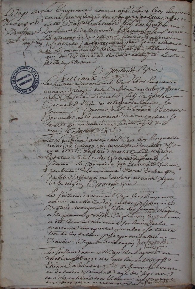 | BERNARD Léonard | Père : BERNARD Jean, N° Sosa 626 Naissance : Date : ca ../../1718 Lieu : Décès : Date : 12/01/1772 Lieu : St-Sulpice-le-Guéretois (23), la Bussière Mère : CACHET Léonarde, N° Sosa 627 Naissance : Date : ca ../../1729 Lieu : Décès : Date : 21/07/1758 Lieu : St-Sulpice-le-Guéretois (23), la Bussière Rang : 1 / 4. | | Naissance | | Naissance | Date | 08/08/1750 | Lieu | St-Sulpice-le-Guéretois (23), la Bussière | | Baptême | Date | 08/08/1750 | Lieu | St-Sulpice-le-Guéretois (23) | | | Personnes citées | Parrain : BERNARD Léonard, Oncle Marraine : CACHET Marie, Tante | Citations : Union : 16/08/1770 St-Sulpice-le-Guéretois (23) , Neveu, BERNARD Léonard & FAUVET Jeanne Décès : 12/01/1772 St-Sulpice-le-Guéretois (23), la Bussière , Fils, BERNARD Jean, N° Sosa 626 Décès : 15/06/1772 St-Sulpice-le-Guéretois (23), les Moulins CACHET Charles Décès : 27/04/1783 St-Sulpice-le-Guéretois (23), La Bussière , Oncle, BERNARD Léonard |
