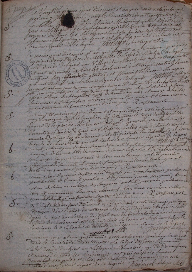 | NAQUET ; VAQUET Jeanne, N° Sosa 609 | Père : NAQUET ; VAQUET Pierre, N° Sosa 1218 Décès : Date : > 1747/.... Lieu : Mère : VIGNERON Marguerite Marie, N° Sosa 1219 Rang : 1 / 2. | | Naissance | | Naissance | Date | ca ../../1724 | Lieu | St-Sulpice-le-Guéretois (23), la Bussière | | Décès | | Décès | Date | 01/05/1784 | Lieu | St-Sulpice-le-Guéretois (23), Claverolles | | | Personnes citées | GLOMAUX Jean, Cousin RIBOULET Jean, Voisin | | Inhumation | Date | 02/05/1784 | Lieu | St-Sulpice-le-Guéretois (23), Le Cimetière | Citations : Décès : 09/08/1766 St-Sulpice-le-Guéretois (23), Claverolles , Mère, CHATEAUVIEUX Marguerite | | Union avec CHATEAUVIEUX Martial | | | Date | 10/02/1744 | Lieu | St-Sulpice-le-Guéretois (23) | Age Age | 17 ans | | | Personnes citées | CHATEAUVIEUX Jean, né vers 1685, Père GUYONET Léonard, Oncle VINCENT Léonard, Oncle GERY Pierre, Frère uterin | 12 enfants sont nés de cette union. 1. CHATEAUVIEUX Catherine | 2. CHATEAUVIEUX Marie Union : Date : 29/01/1782 Lieu : St-Sulpice-le-Guéretois (23) avec CHAMPAGNE Pardoux Décès : Date : 13/09/1809 Lieu : St-Sulpice-le-Guéretois (23), Banassat | 3. CHATEAUVIEUX Pierre Union : Date : 29/01/1782 Lieu : St-Sulpice-le-Guéretois (23) avec GUILLOT Marie Union : Date : 07/02/1786 Lieu : St-Sulpice-le-Guéretois (23) avec COLOMBEIRON Marguerite | 4. CHATEAUVIEUX Jean Naissance : Date : 17/10/1745 Lieu : St-Sulpice-le-Guéretois (23), Cherpelat | 5. CHATEAUVIEUX Louise Naissance : Date : 18/02/1747 Lieu : St-Sulpice-le-Guéretois (23), Cherpelat Décès : Date : 19/02/1747 Lieu : St-Sulpice-le-Guéretois (23), Cherpelat à l'âge de 1 jour. | 6. CHATEAUVIEUX Silvaine Naissance : Date : 18/02/1747 Lieu : St-Sulpice-le-Guéretois (23), Cherpelat Décès : Date : 20/02/1747 Lieu : St-Sulpice-le-Guéretois (23), Cherpelat à l'âge de 2 jours. | 7. CHATEAUVIEUX Pierre, N° Sosa 304 Naissance : Date : 09/12/1749 Lieu : St-Sulpice-le-Guéretois (23), Claverolles Personnes citées : 1. Parrain : CHATEAUVIEUX Pierre, Maçon, Laboureur, Oncle 2. Marraine : CHATEAUVIEUX Jeanne, Cousine Union : Date : 22/02/1773 Lieu : St-Sulpice-le-Guéretois (23) avec AUBELLE ; AUBAISLE ; AUBAYLE ; AUBEL Françoise, N° Sosa 305 Décès : Date : ../../1809 Lieu : à l'âge de 59 ans. | 8. CHATEAUVIEUX Antoine Naissance : Date : 23/09/1753 Lieu : St-Sulpice-le-Guéretois (23), Claverolles Décès : Date : 31/12/1753 Lieu : St-Sulpice-le-Guéretois (23), Claverolles à l'âge de 3 mois. | 9. CHATEAUVIEUX François Naissance : Date : 08/09/1755 Lieu : St-Sulpice-le-Guéretois (23), Claverolles Décès : Date : 05/03/1764 Lieu : St-Sulpice-le-Guéretois (23), Claverolles à l'âge de 8 ans. | 10. CHATEAUVIEUX Pierre Naissance : Date : 30/09/1758 Lieu : St-Sulpice-le-Guéretois (23), Claverolles | 11. CHATEAUVIEUX Marie Naissance : Date : 03/09/1761 Lieu : St-Sulpice-le-Guéretois (23), Claverolles | 12. CHATEAUVIEUX Marguerite Naissance : Date : 18/08/1765 Lieu : St-Sulpice-le-Guéretois (23), Claverolles Décès : Date : 09/08/1766 Lieu : St-Sulpice-le-Guéretois (23), Claverolles à l'âge de 11 mois. |
